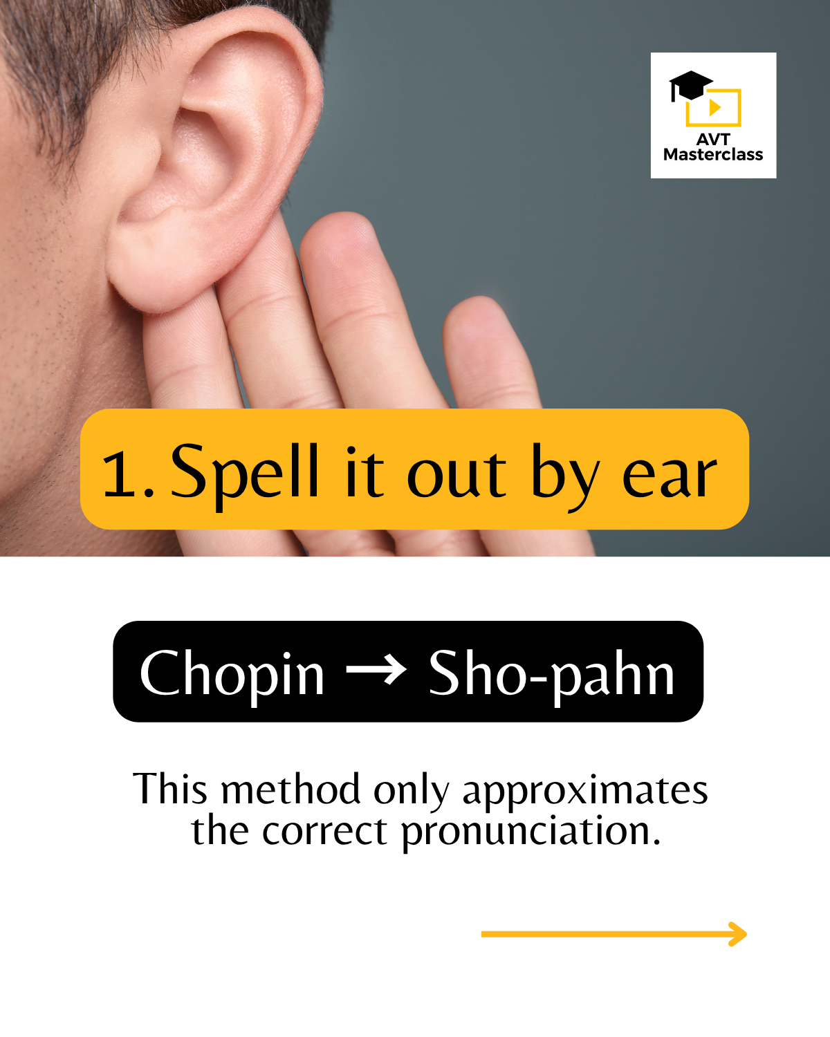 A quick fix is to approximate pronunciation using familiar spellings. For example, you might write Chopin as Sho-pahn. It’s intuitive, but not precise — this method only gives a rough idea of how a word should sound.