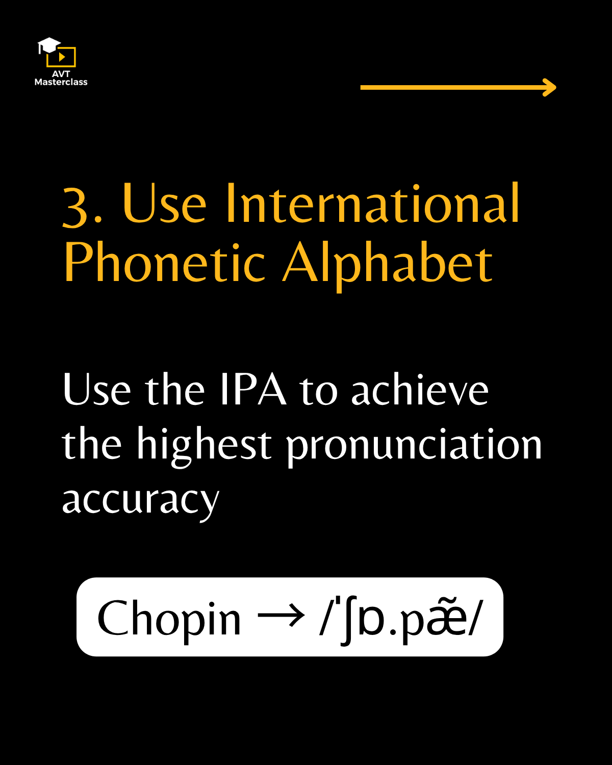The most accurate and consistent method is to use IPA — a system of writing sounds using internationally recognised symbols. With IPA, Chopin is written as /ˈʃɔ.pɛ̃/, capturing the exact pronunciation without ambiguity.